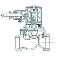 該閥是由電磁先導(dǎo)及閥及主閥兩在部分組成,當(dāng)通電時,鐵芯被電磁力吸起,打開先導(dǎo)閥口,使膜片上腔的介
